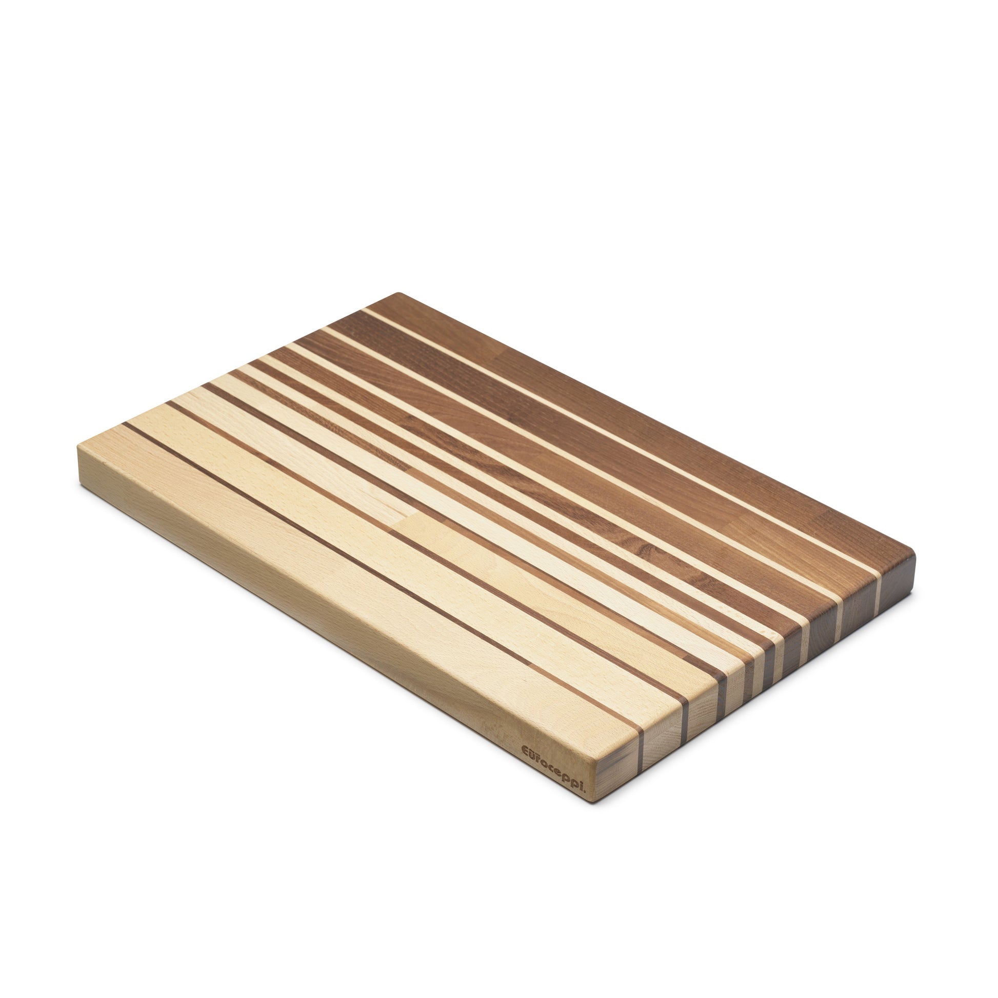 Elegante tagliere in legno massello con effetto strisce, realizzato in una combinazione di faggio e robinia evaporata.
